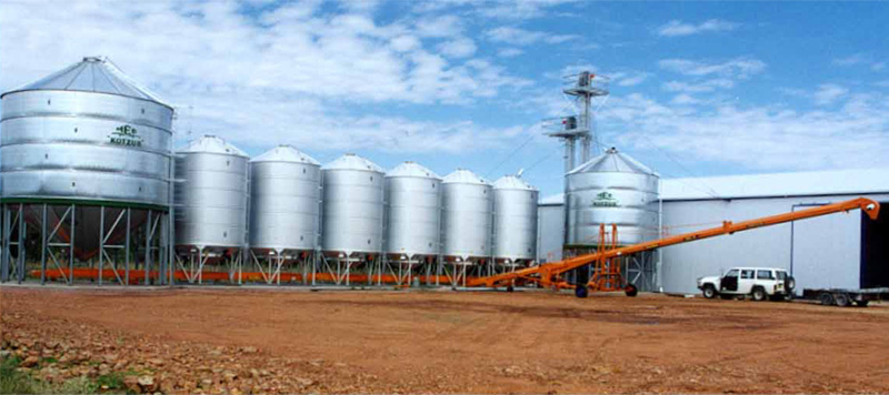 - ‘In-Line’ or ‘cluster’ silo complex is used in conjunction with high performance Aust-Mech Conveyors, resulting in a simple, rugged and cost effective storage and handling solution.